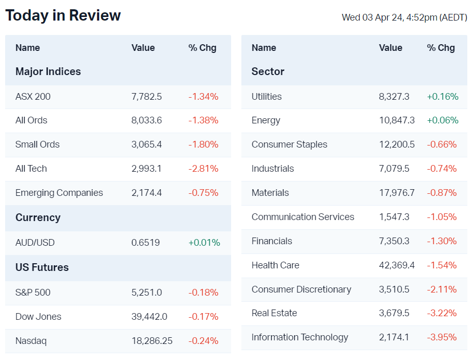The S&P/ASX 200 fell 105.4 points, 1.34%.
