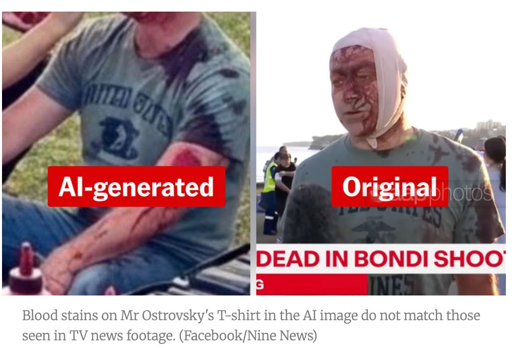 An image purporting to show a man having fake blood applied by a make-up artist before the Bondi Beach attack was created using artificial intelligence (AI).