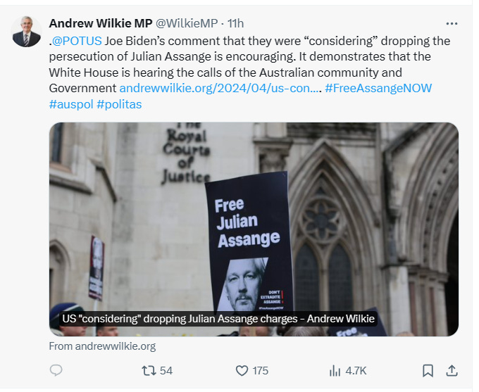 “In February, the Australian House of Representatives voted overwhelmingly in favour of my motion calling on the United Kingdom and United States governments to bring this matter to an end and to allow Mr Assange to return home. The vote, which was supported by Prime Minister Anthony Albanese and his Cabinet, marked an unprecedented show of political support for Mr Assange and echoes the sentiment in the Australian community that enough is enough. Obviously these signals are resonating in the White House and people can get some comfort that the US Government is listening to the Australian Government.