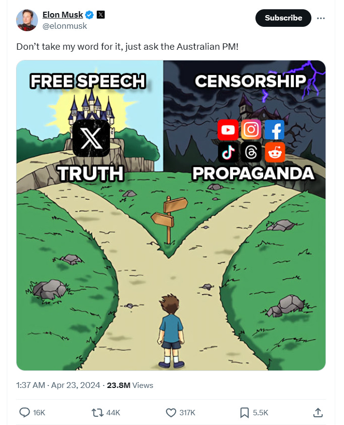 The billionaire American shared a cartoon on his personal X account that depicted the platform as a path to "freedom" and "truth" akin to that of the Wizard of Oz, with a darker, alternate path leading to "censorship" and "propaganda."