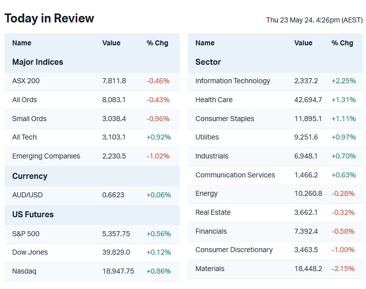 The S&P/ASX 200 closed 36.3 points lower, down 0.46%.