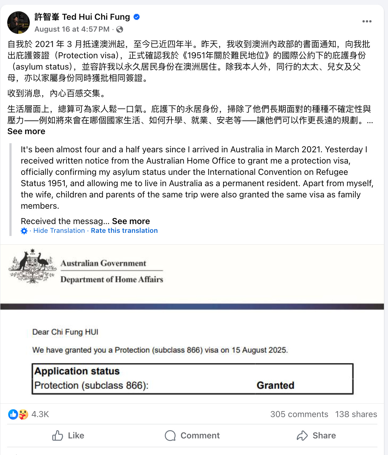 • Family reunion: Hui settled in Adelaide after fleeing Hong Kong via Europe, initially uncertain whether Australia would grant long-term protection