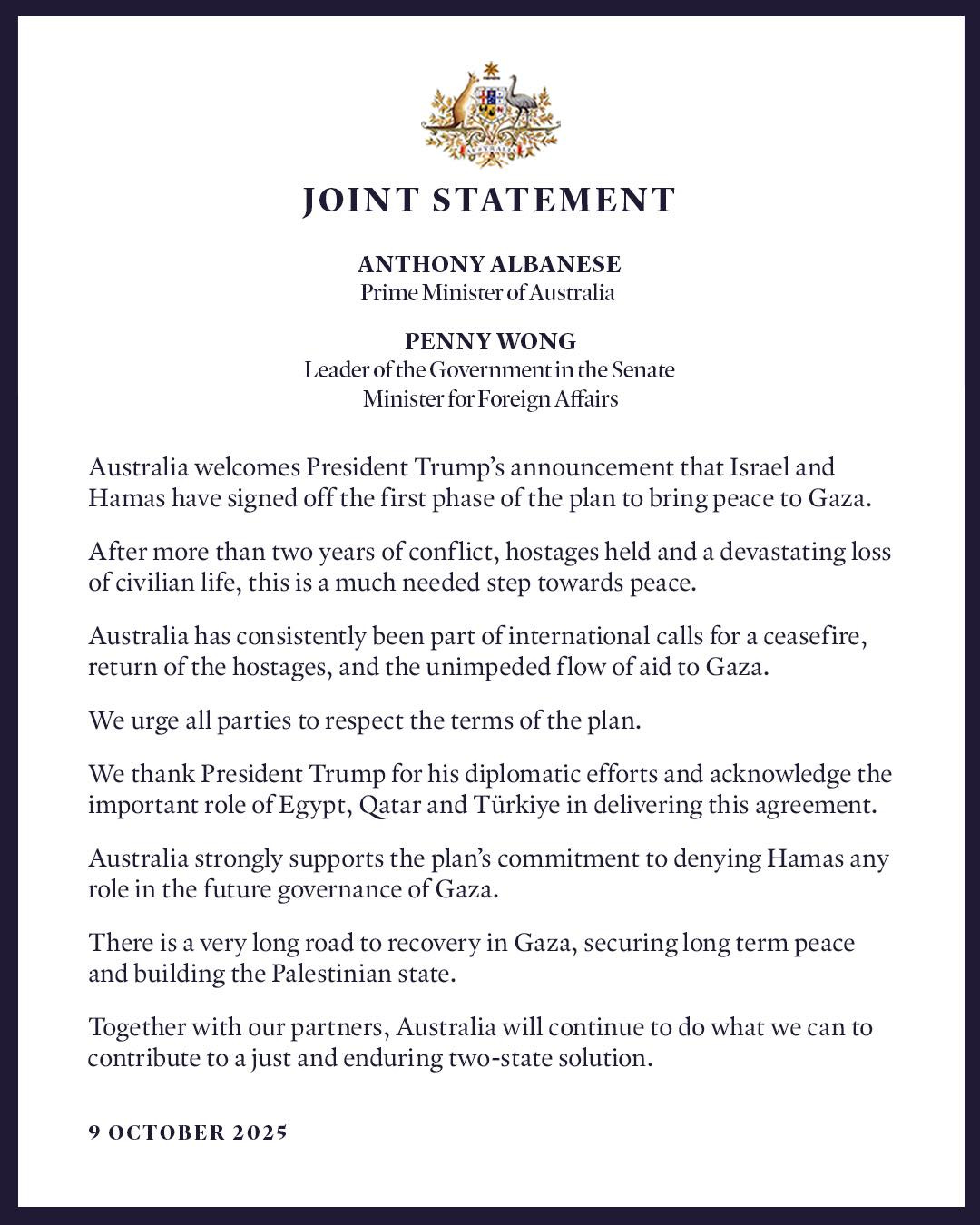 The Prime Minister outlined Australia’s stance throughout the conflict: “Throughout this devastating conflict, Australia has consistently been part of the international calls for a ceasefire, for the return of hostages, and for the flow of humanitarian aid to Gaza.”