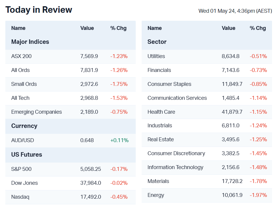The S&P/ASX 200 closed 94.2 points lower, down 1.23%.