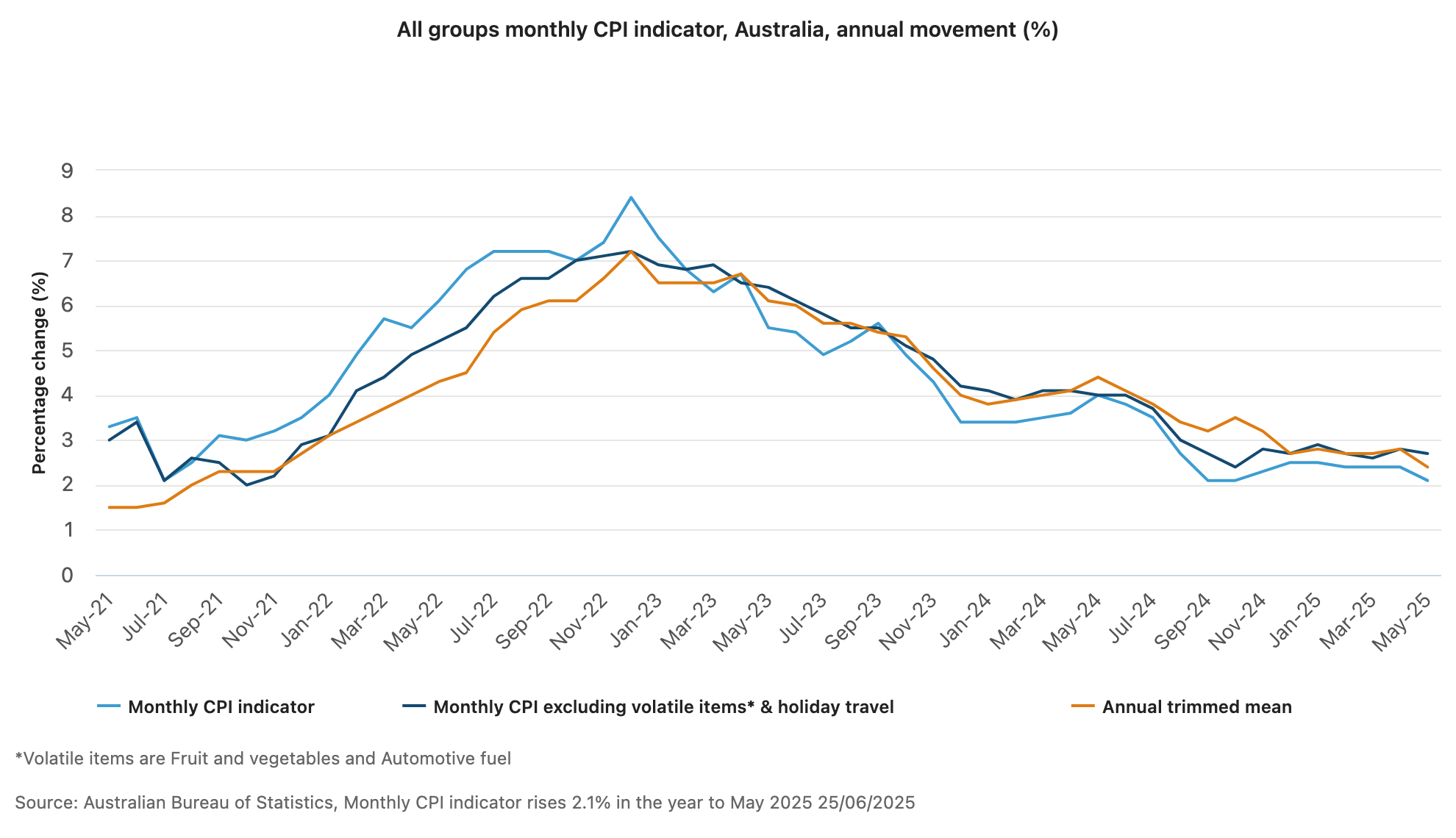 What happened: Australia's monthly Consumer Price Index indicator hit 2.1% annually in May 2025, down from 2.4% in April, marking the lowest inflation reading since October 2024, according to the Australian Bureau of Statistics released today. The trimmed mean—economists' preferred underlying inflation measure—dropped to 2.4%, its lowest level since November 2021.