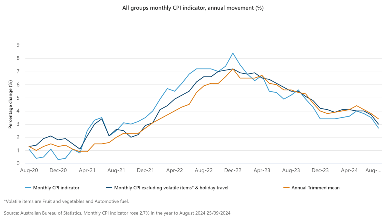 Australia's Consumer Price Index rose 2.7% in the 12 months to August 2024, the weakest inflation since August 2021. The fall was broadly based on large falls in electricity and fuel prices: record falls in electricity from government rebates, with fuel prices also falling significantly. But price rises were recorded for categories such as housing and food, while rental markets were still quite competitive in most capital cities.