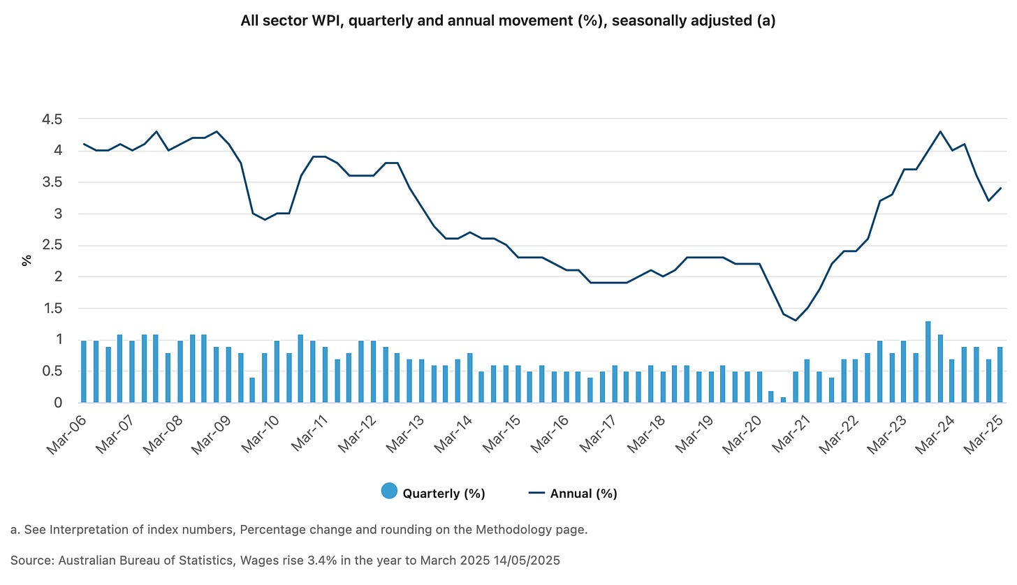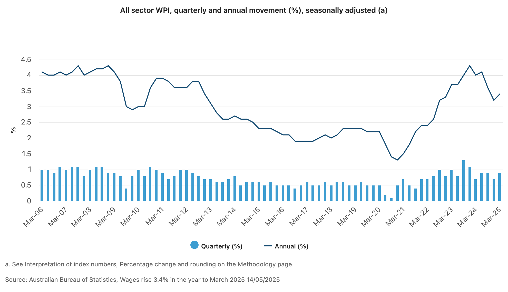 According to the Australian Bureau of Statistics (ABS) data released today, the Wage Price Index rose 0.9% in the March quarter alone, maintaining the same quarterly growth rate as the previous period.