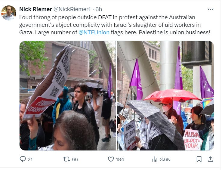 Following the deaths of seven aid workers in Gaza, including Australian Zomi Frankcom, a spontaneous protest was staged this afternoon outside the Department of Foreign Affairs and Trade (Dfat) offices in Sydney.