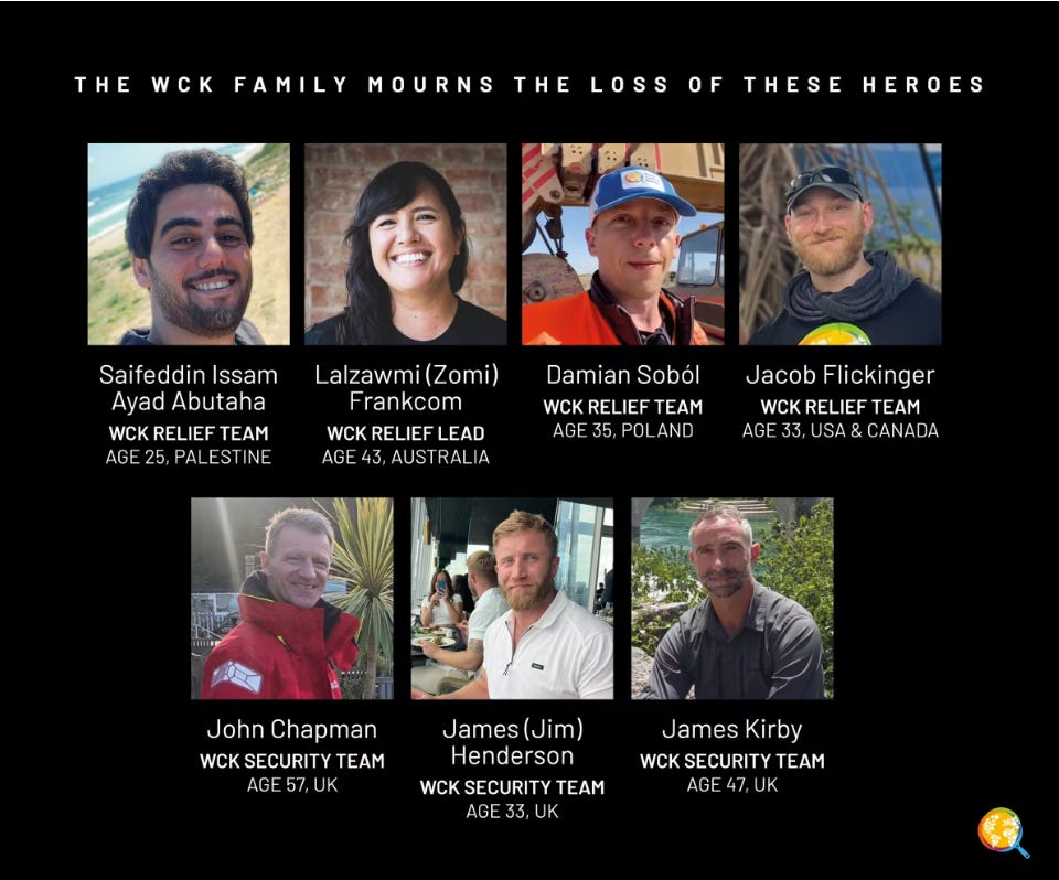 “These are the heroes of World Central Kitchen. These 7 beautiful souls were killed by the IDF in a strike as they were returning from a full day's mission. Their smiles, laughter, and voices are forever embedded in our memories. And we have countless memories of them giving their best selves to the world. We are reeling from our loss. The world's loss.” - Erin Gore, CEO