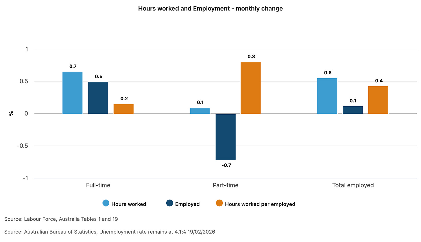 On a trend basis, the picture was more encouraging. The trend unemployment rate fell from 4.2 per cent in December to 4.1 per cent in January — continuing a downward trajectory that has now extended across four consecutive months of declining unemployed persons.