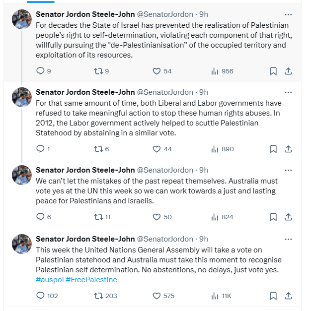 Earlier, Senator for the Greens and spokeswoman for foreign affairs Jordon Steele-John says that Australia shouldn't wait to vote on whether to recognise Palestine as a state; it should "just vote yes."