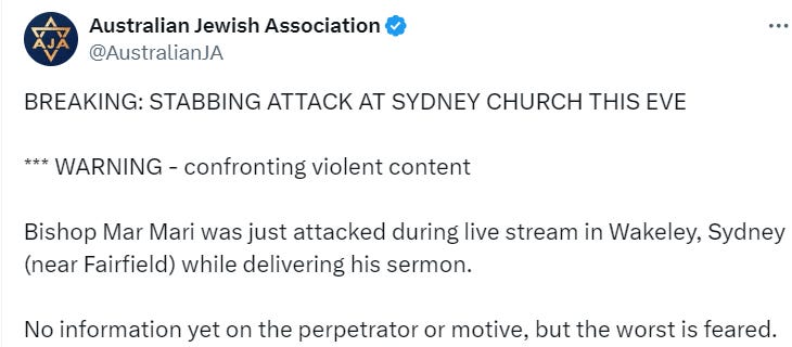 Just two days after a large-scale stabbing in a crowded mall shocked Sydney, Australia, a number of people, including a bishop, were reportedly stabbed on Monday.