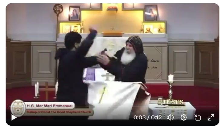 A man wearing all black is seen in a video that has gone viral on social media approaching Mar Mari Emmanuel, the bishop of Christ the Good Shepherd.