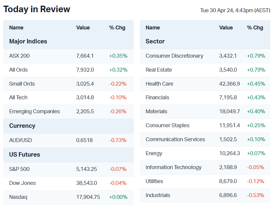 The S&P/ASX 200 closed 26.7 points higher, up 0.35%.