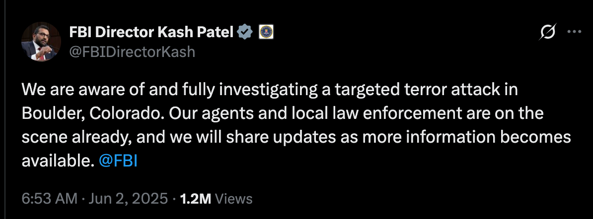 FBI Director Kash Patel, in a statement, described the incident as a targeted terror attack and said agents were on the scene.