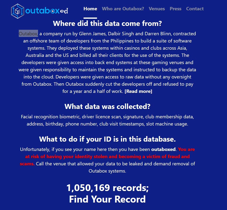 "Outabox has become aware of a potential breach of data by an unauthorised third party from a sign in system used by our clients. We are working as a priority to determine the facts around this incident, have notified the relevant authorities and are investigating in cooperation with law enforcement.