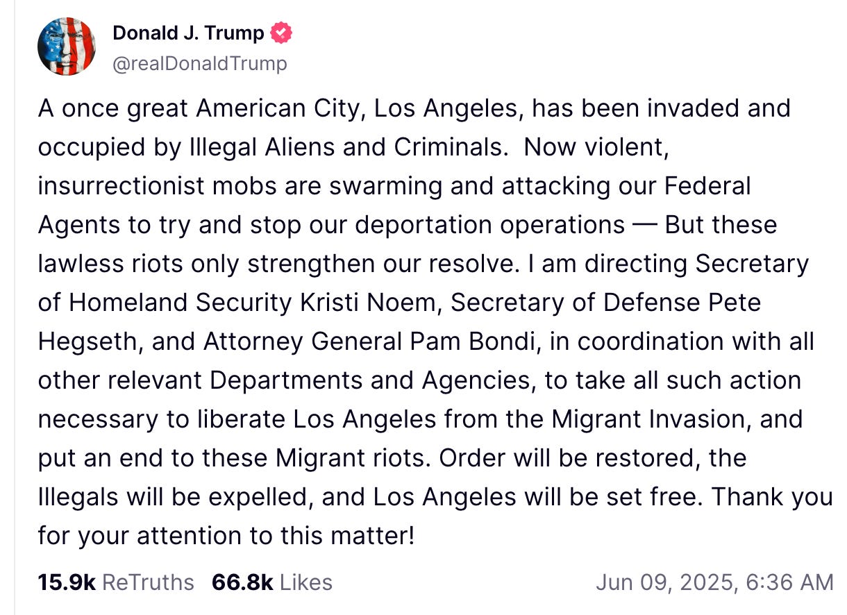 A constitutional showdown emerged Sunday as President Donald Trump invoked rarely-used federal authority to deploy National Guard troops in California against Governor Gavin Newsom's wishes, setting up the most significant federal-state confrontation since the civil rights era.