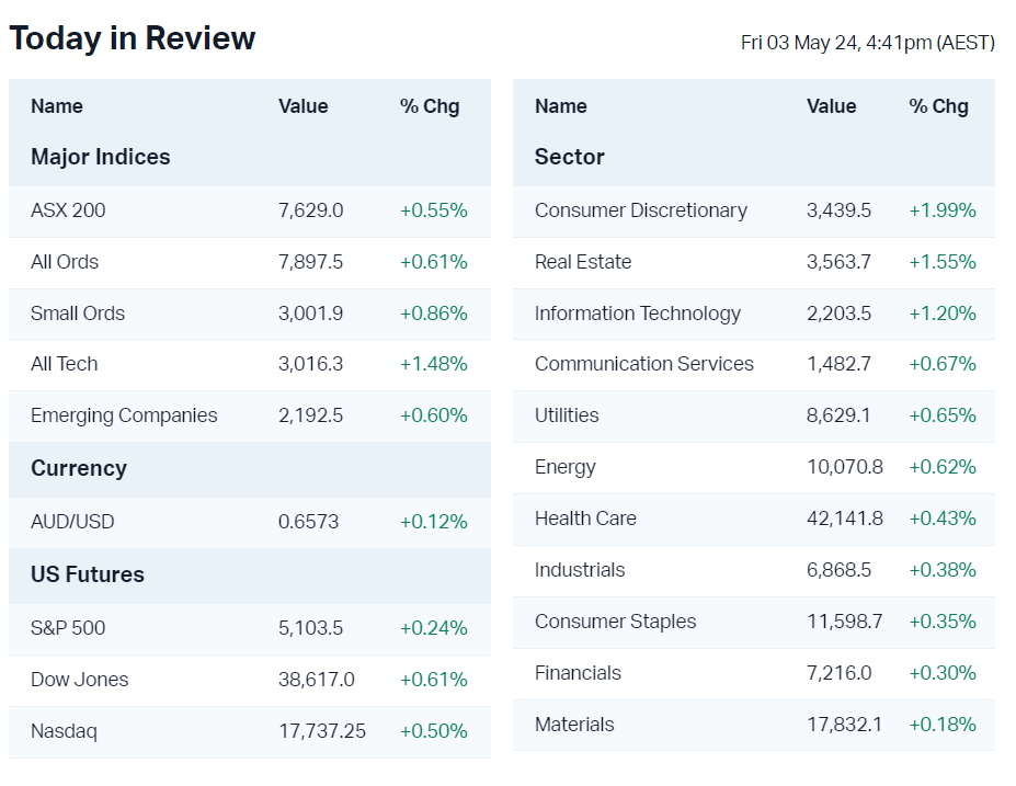 The S&P/ASX 200 closed 42.0 points higher, up 0.55%.