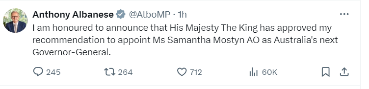 On behalf of The Nationals, congratulations to Ms Samantha Mostyn AO on her appointment as our next Governor-General. Ms Mostyn has had an extensive career in the business community, advocating for women and has held many positions of leadership.