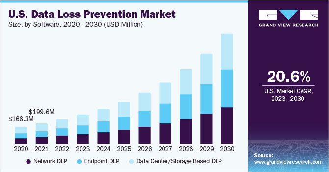 Grand View Research, Inc. predicts the global data loss prevention market will reach USD 9.33 billion by 2030 and grow at a 22.3% CAGR from 2023 to 2030. Data protection requires data loss prevention (DLP) technology.