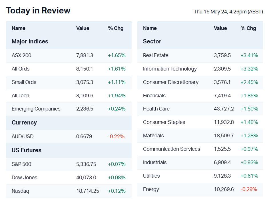 The S&P/ASX 200 closed 127.6 points higher, up 1.65%.