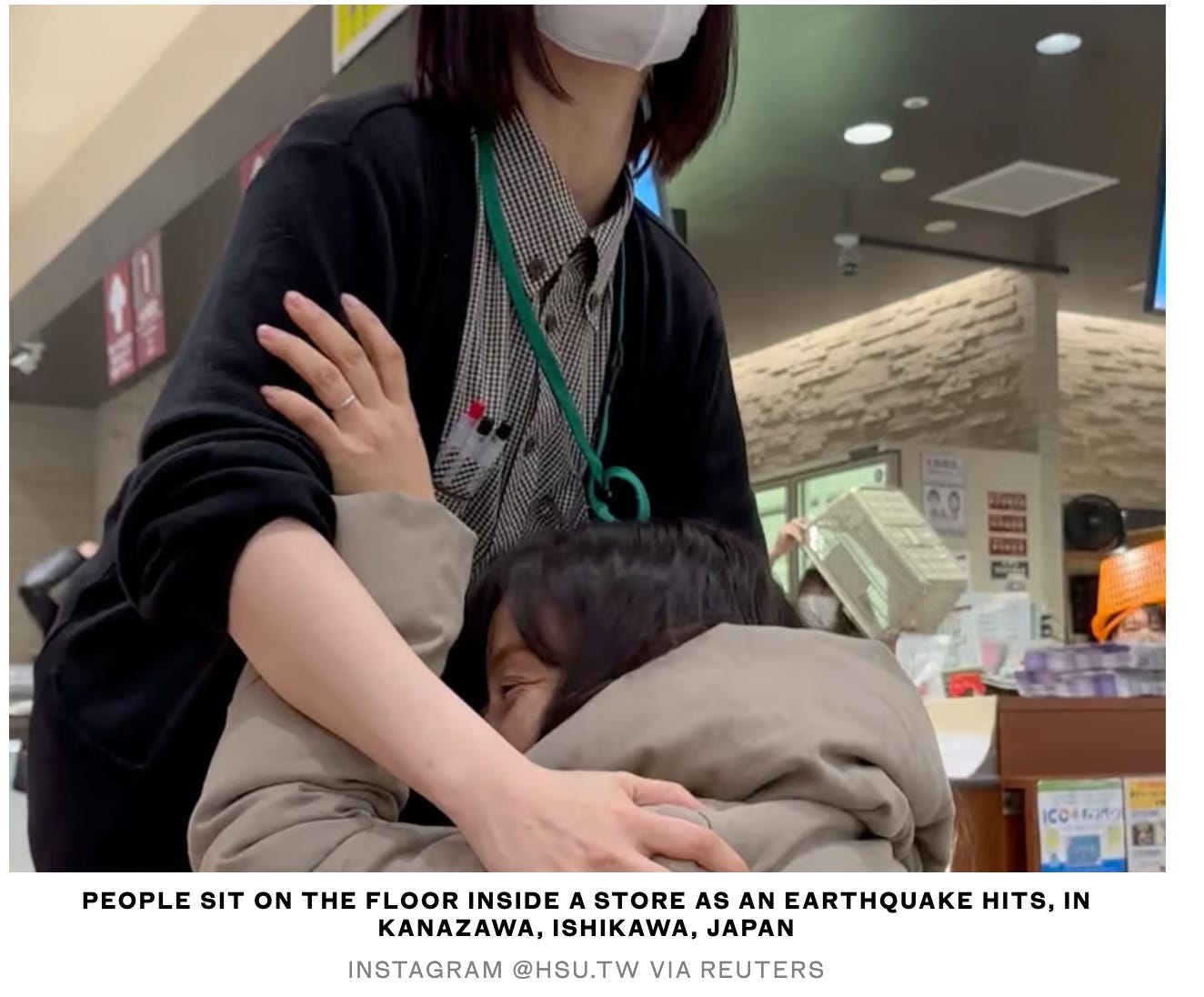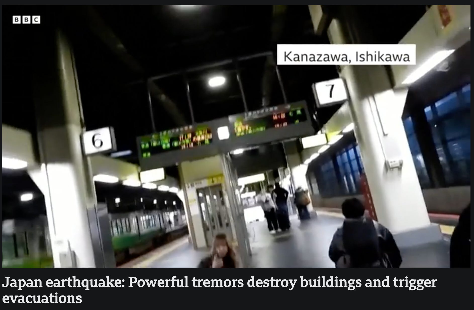 BBC News reported on January 2, 2024: "Japan earthquake: Powerful tremors destroy buildings and trigger evacuations" with video matching the circulating clips