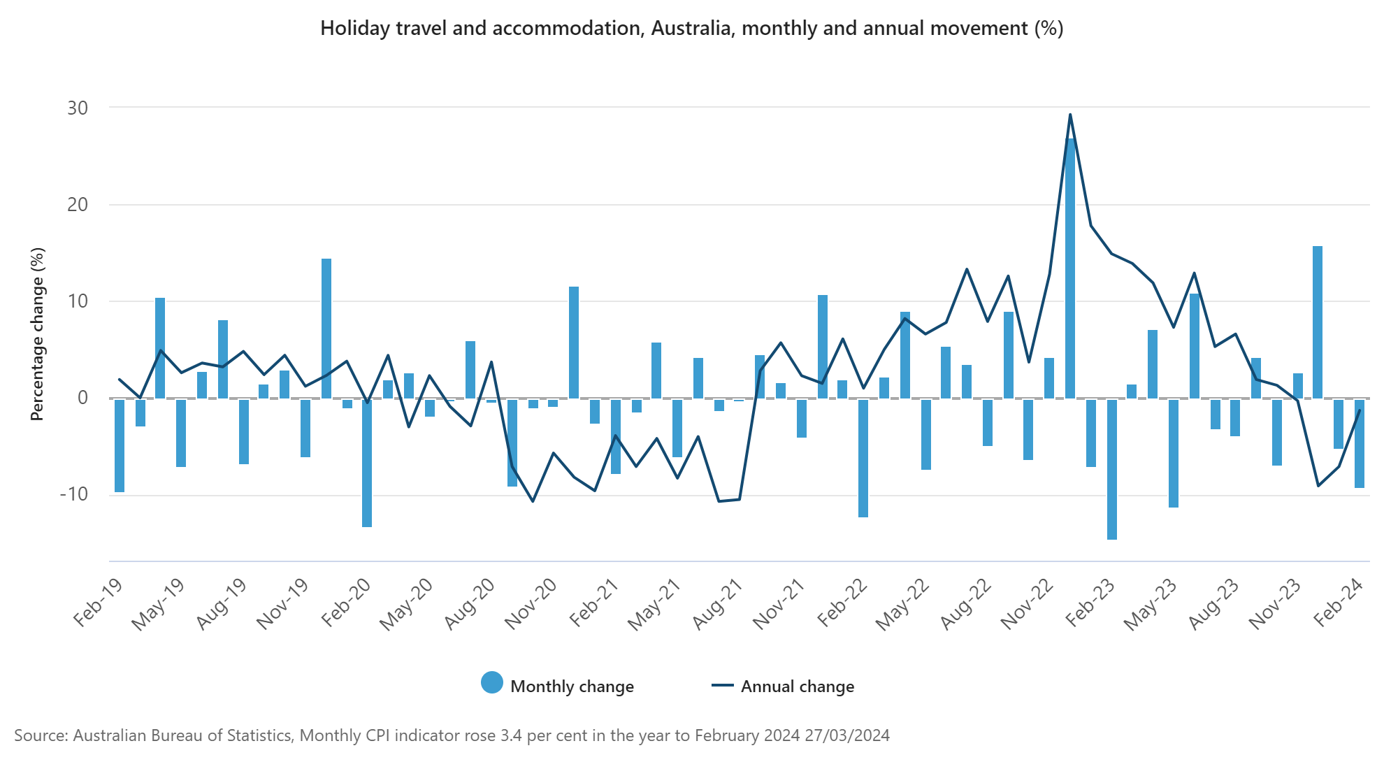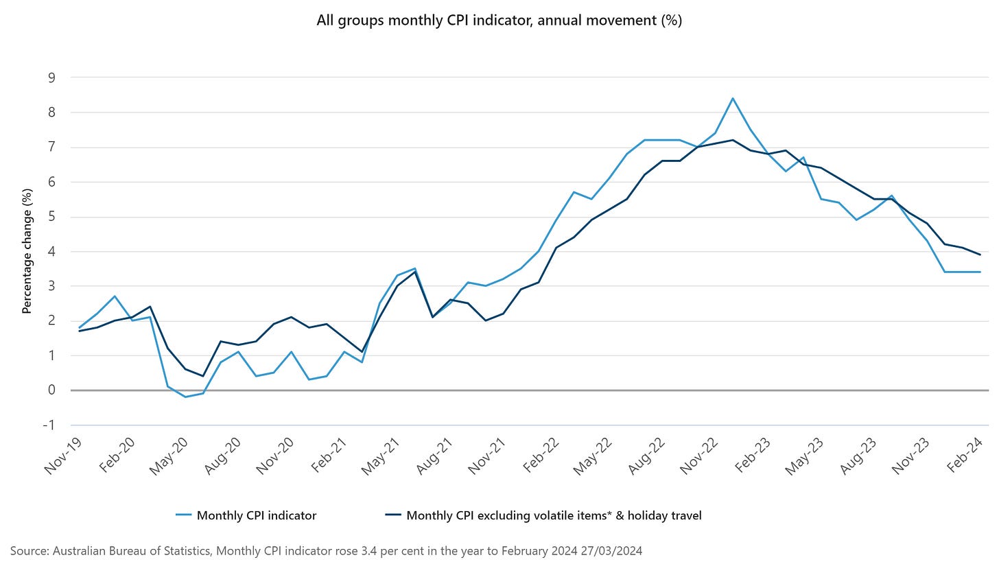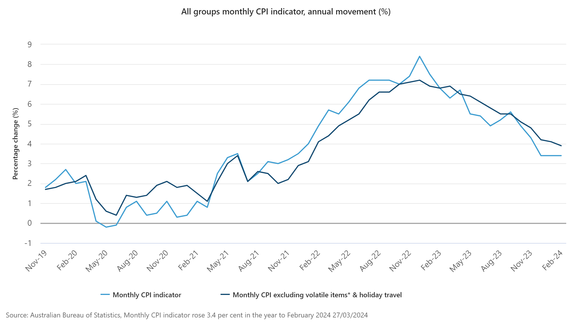 The most recent data from the Australian Bureau of Statistics (ABS) shows that in the 12 months leading up to February 2024, the monthly Consumer Price Index (CPI) indicator increased by 3.4%.
