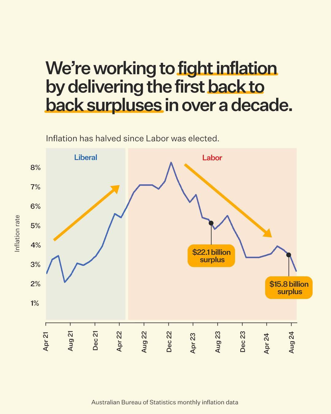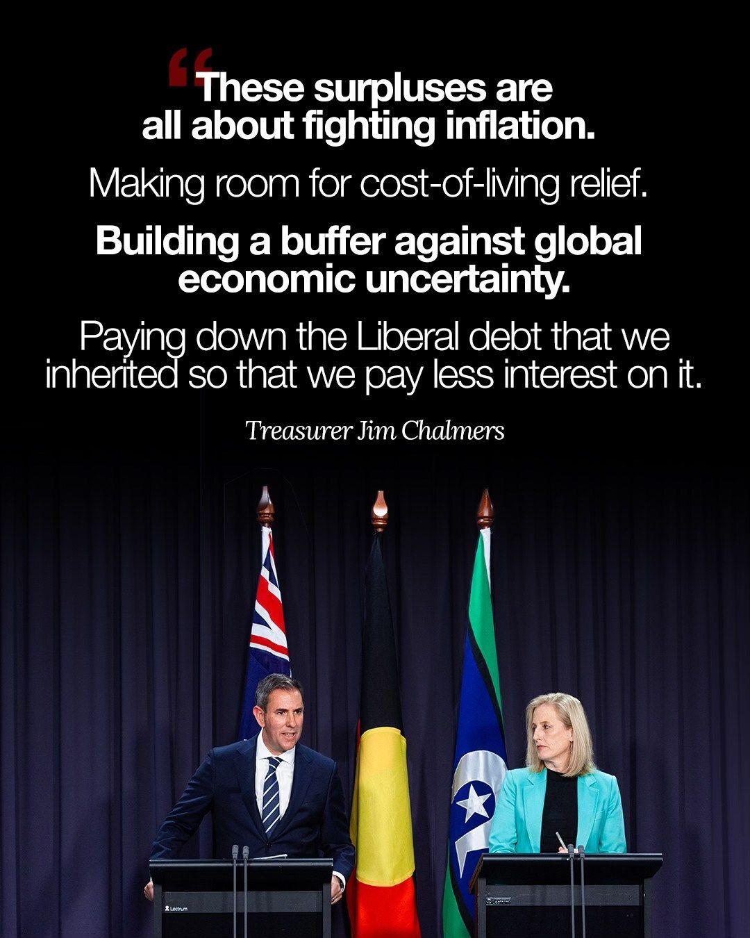 Prime Minister Anthony Albanese announced an AUD 15.8 billion budget surplus, following last year's $22 billion surplus, as the largest back-to-back surpluses on record. This fiscal record comes along with inflation shrinking from 3.5% to 2.7%.