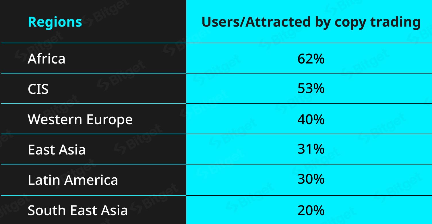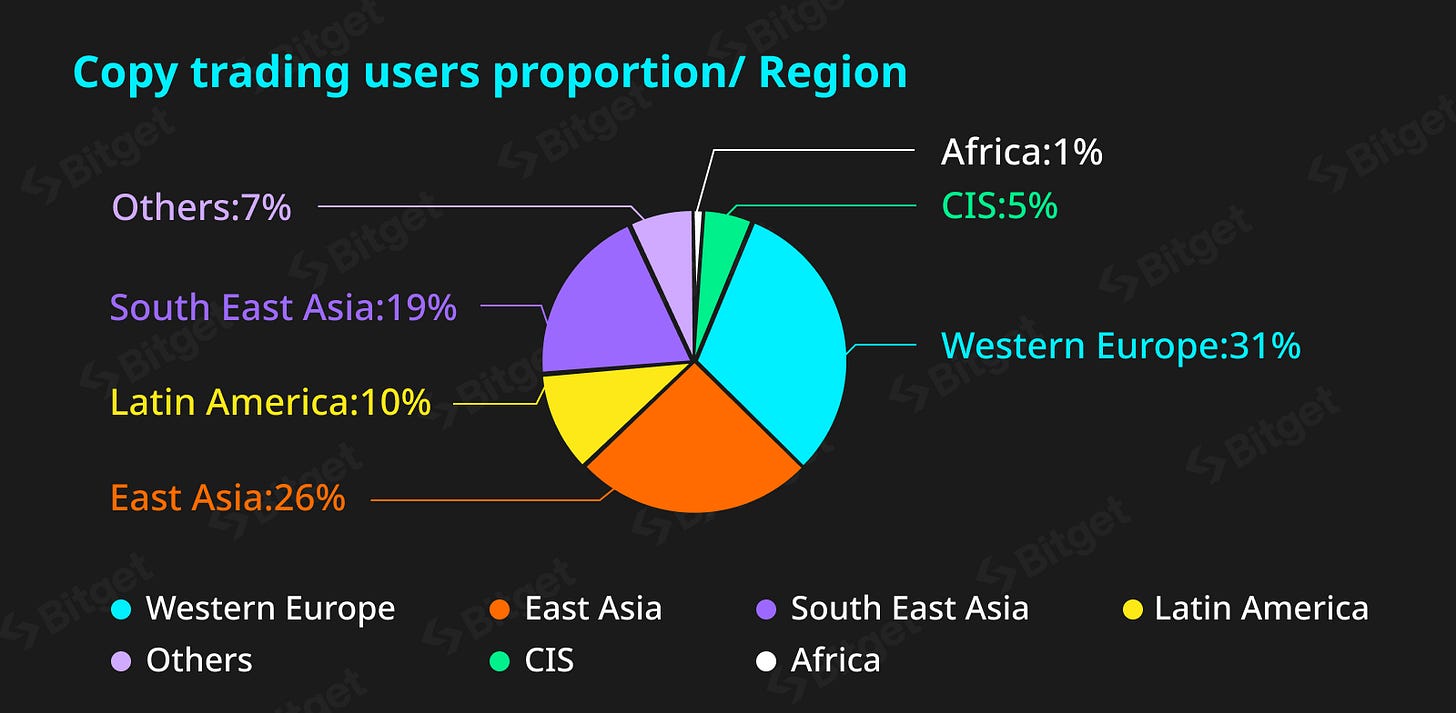 Geographically speaking, the majority of Bitget's copy merchants are based in South-east Asia, East Asia, and Western Europe. With 31% of all copy trade users, Western Europe has the highest proportion among these regions, closely followed by East Asia (26%), South-east Asia (19%), and Asia (26%) respectively. African users make up a small part of users, but they show the highest levels of interest due to the continent's developing cryptocurrency markets, where users are frequently less experienced and more likely to use copy trading as a starting point.