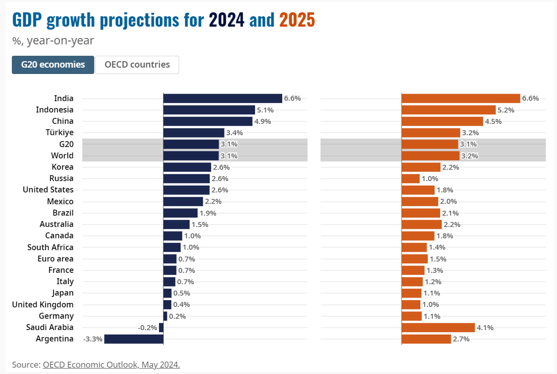 The most recent Economic Outlook from the OECD predicts that the world economy will continue to grow modestly. According to the Economic Outlook, global GDP will grow steadily in 2024 at a rate of 3.1%, the same as in 2023, before slightly increasing to 3.2% in 2025.