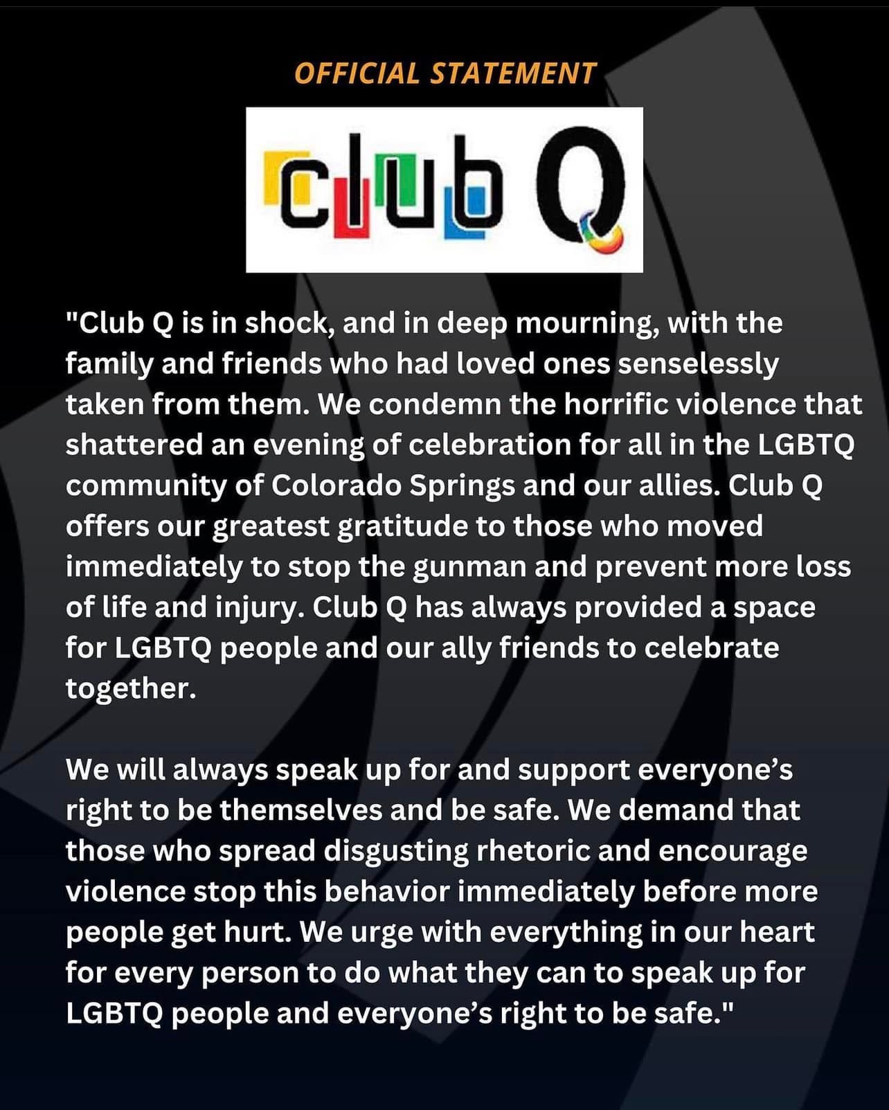 From Pulse to Colorado Springs to so many other lives stolen from us— this has occurred for far too long. HRC mourns the lives taken at Club Q last night and extends our deepest strength, love and condolences to the loved ones impacted.” - Human Rights Campaign Incoming President Kelley Robinson