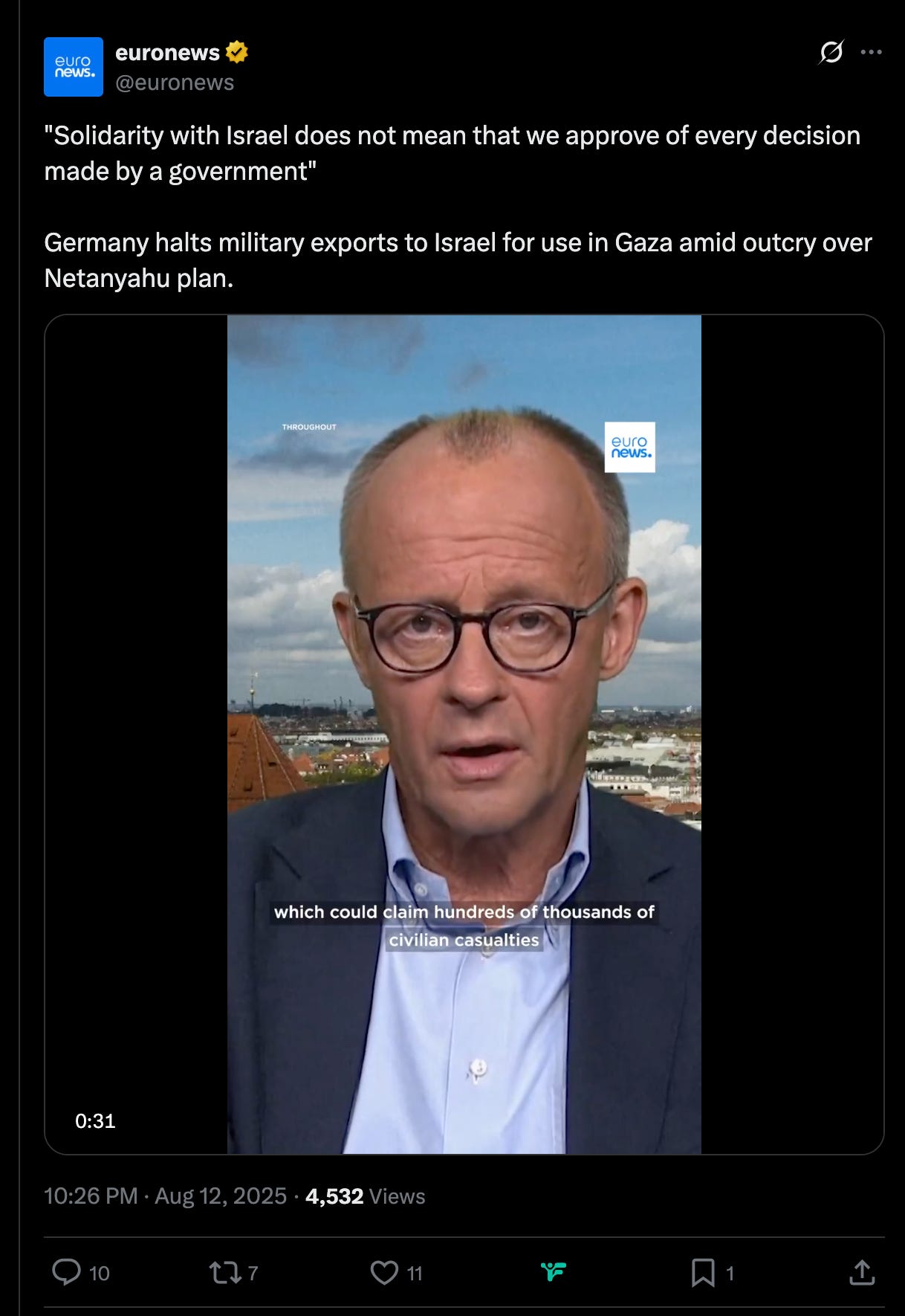 Germany has now taken the lead in this respect by suspending military exports to Israel over its decision to expand the war. Slovenia also banned all weapons trade with Israel this month.