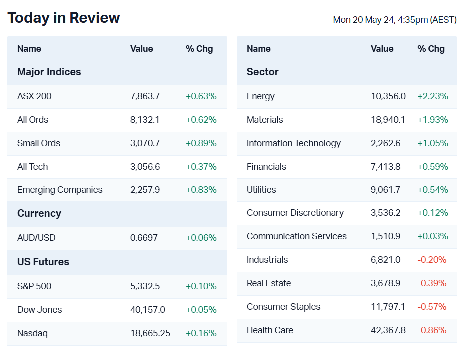 The S&P/ASX 200 closed 49.3 points higher, up 0.63%.
