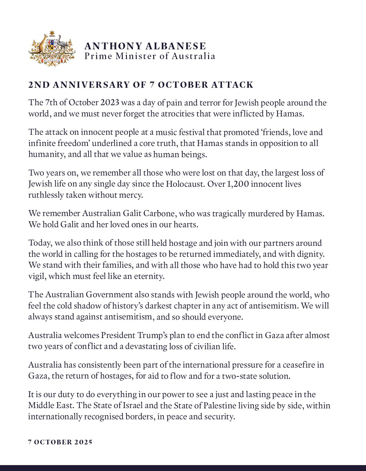 Albanese said yesterday that October 7 “is the two year anniversary of the greatest number of murders of Jewish people since the Holocaust” and warned demonstrations on the anniversary “will not advance” the Palestinian cause but “will set it back in terms of support here in Australia.”