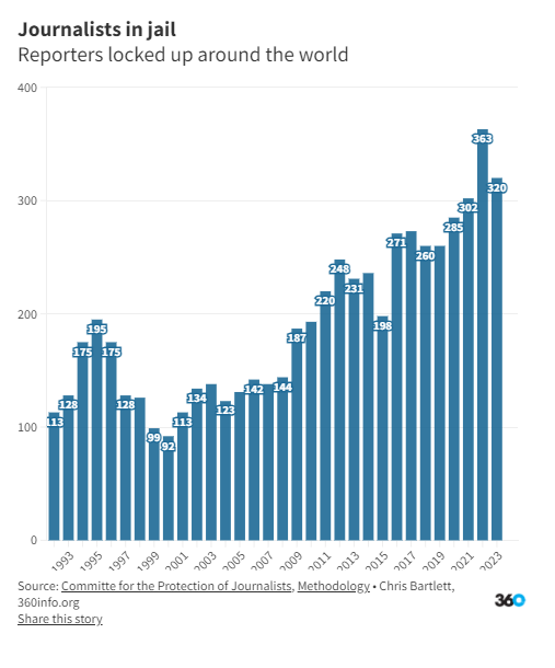 The CPJ also tracks the number of journalists in prison around the world, with a snapshot taken on December 1 each year. Last year was the second highest on record with 320 behind bars. (It was also the first time Israel made the top six jailers of journalists, by imprisoning Palestinian reporters in the West Bank.) The figures have also steadily increased since 2000 when only 92 were behind bars.