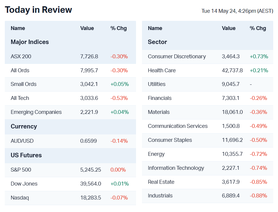 The S&P/ASX 200 (XJO) finished 23.2 points lower at 7,726.8, 0.16% from its session low and 0.30% from its high. In the broader-based S&P/ASX 300 (XKO), advancers lagged decliners by 114 to 158.