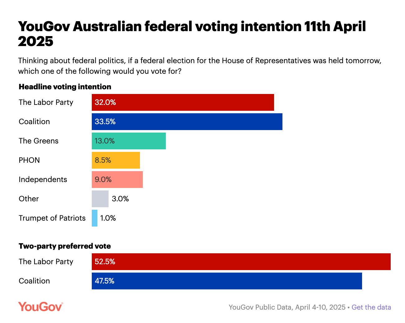 Labor has strengthened its position ahead of the upcoming Federal election, extending its lead over the Coalition to 52.5% - 47.5% in the two-party preferred vote, according to YouGov's latest Public Data poll released today.