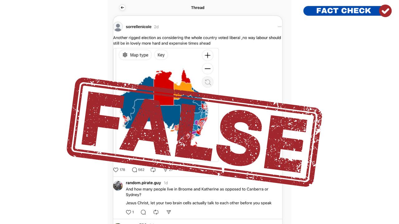 The claim is in a Threads post featuring an electoral map from Guardian Australia's election results webpage published after Labor's election win.
