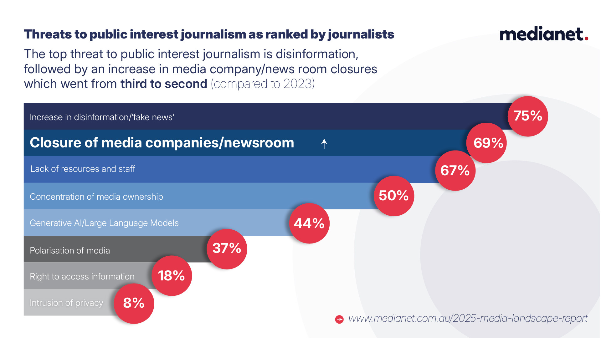 The increasing adoption of AI technologies, amidst widespread concerns about their impact, indicates an industry grappling with a balance between resistance to change and gradual adaptation. With 45% of journalists viewing AI as a threat to public interest journalism (up from 36% last year) and concerns about media outlet closures rising sharply, urgent collaborative efforts are needed to safeguard the foundations of Australia's information ecosystem.