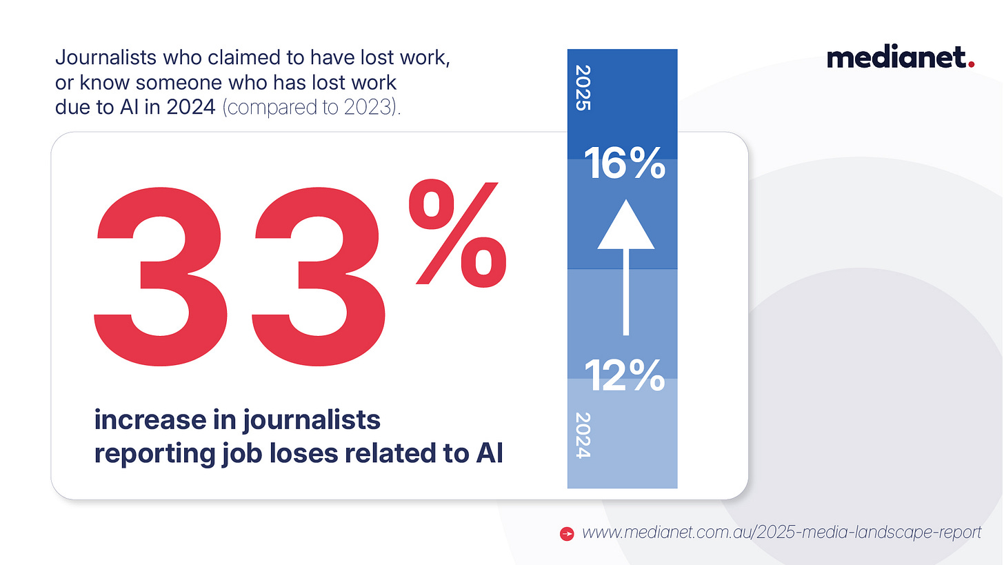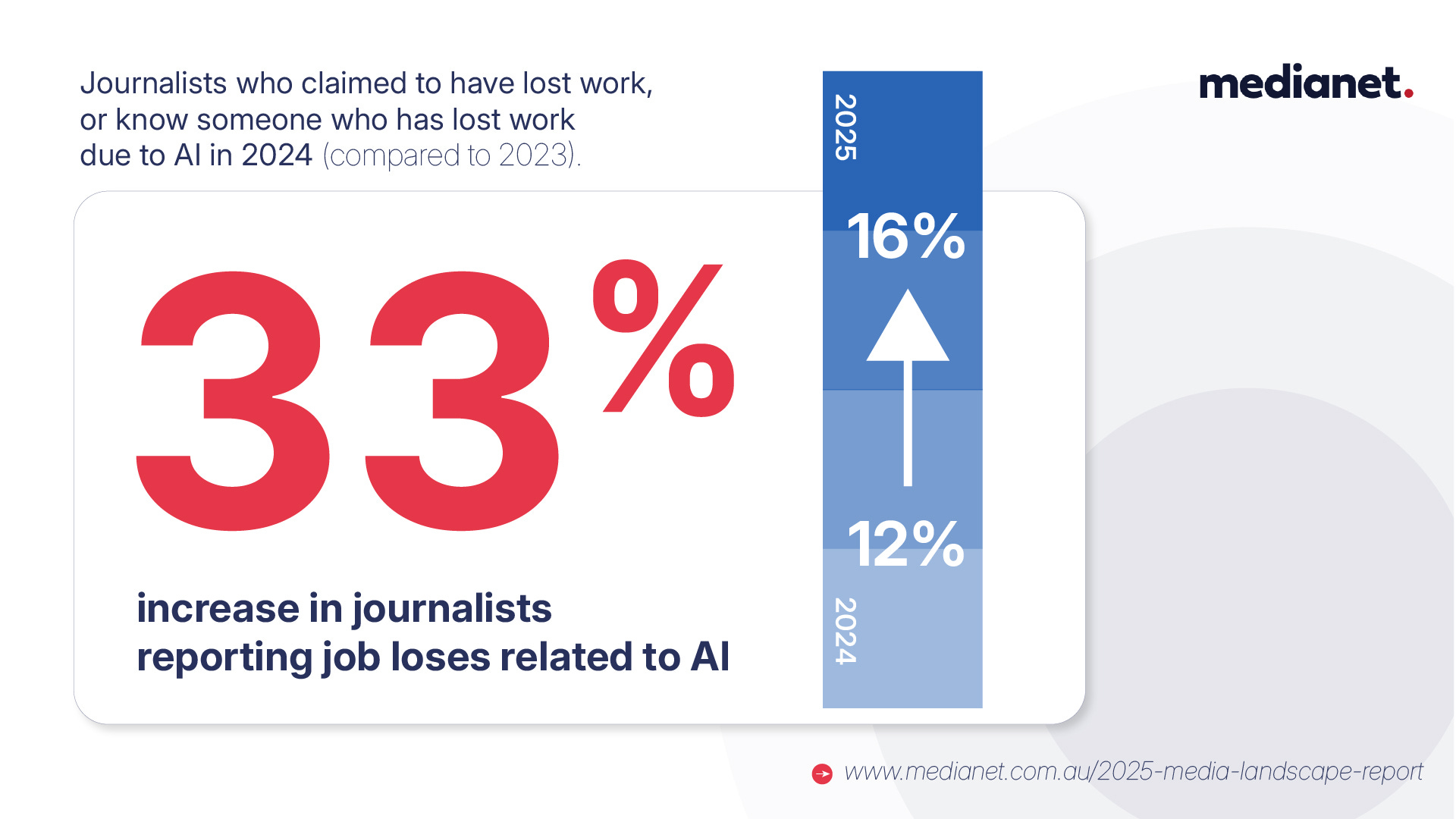 16% of journalists have experienced job losses due to AI adoption, representing a 33% increase from the previous year's figures.
