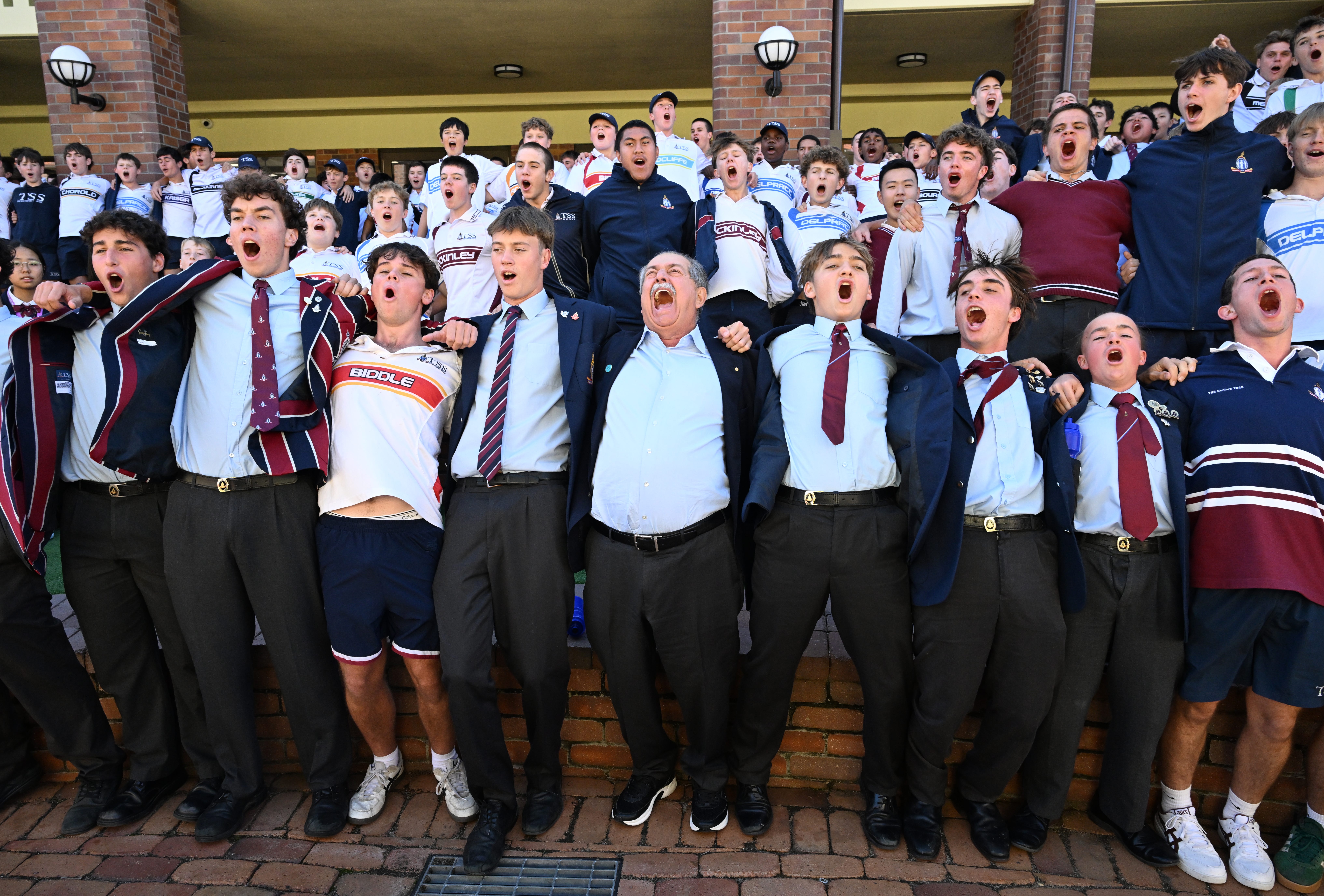 Brisbane 2032 Organising Committee President, Andrew Liveris (centre) is seen participating in the school “war cry” with students at The Southport School on the Gold Coast, Thursday, June 5, 2025. The Brisbane 2032 Organising Committee met with local Gold Coast school students from The Southport School and St Hilda’s School.