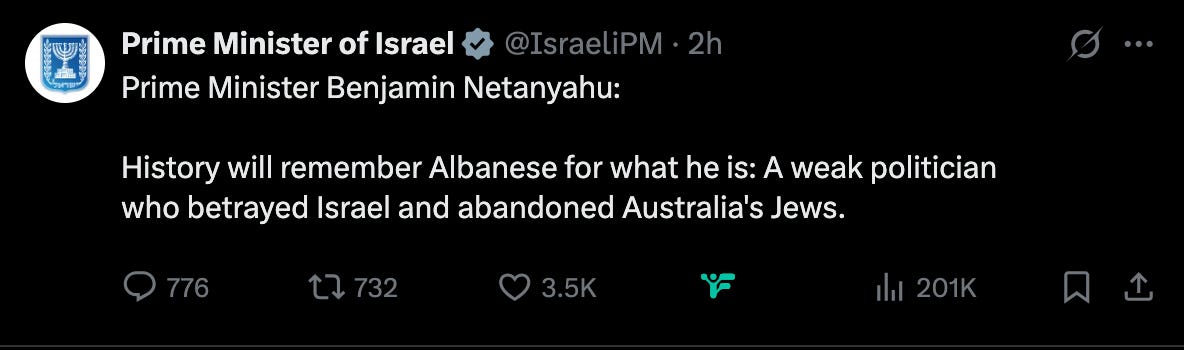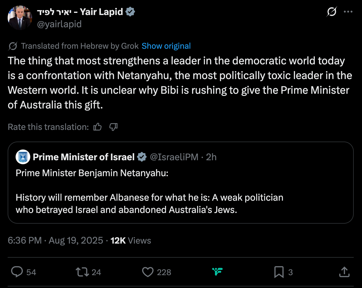 "The thing that strengthens a leader in the democratic world today most is a confrontation with Netanyahu, the most politically toxic leader in the Western world," Lapid posted on X. "It is unclear why Bibi is in such a hurry to give the Australian Prime Minister this gift."