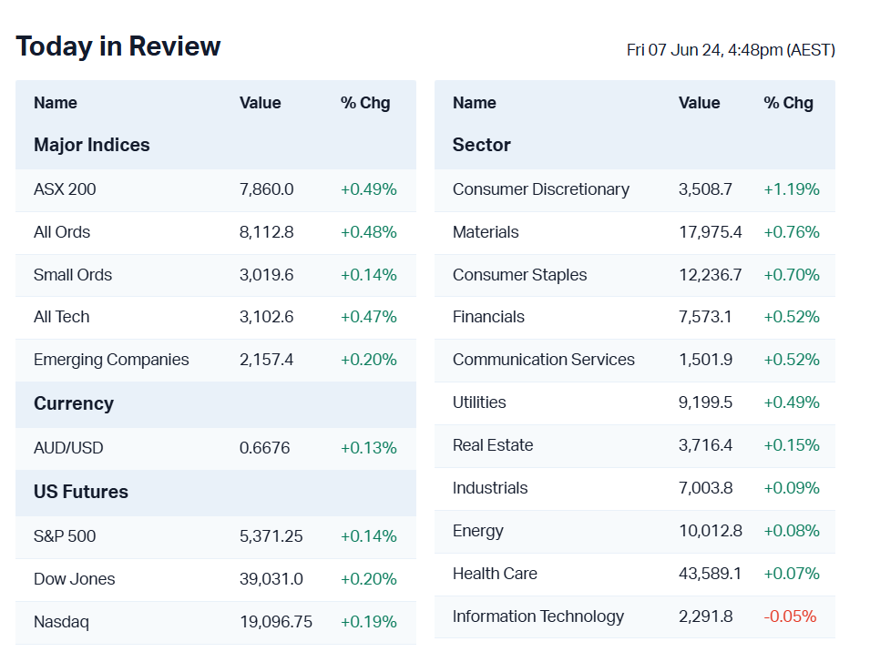 The S&P/ASX 200 closed 38.2 points higher, up 0.49%.