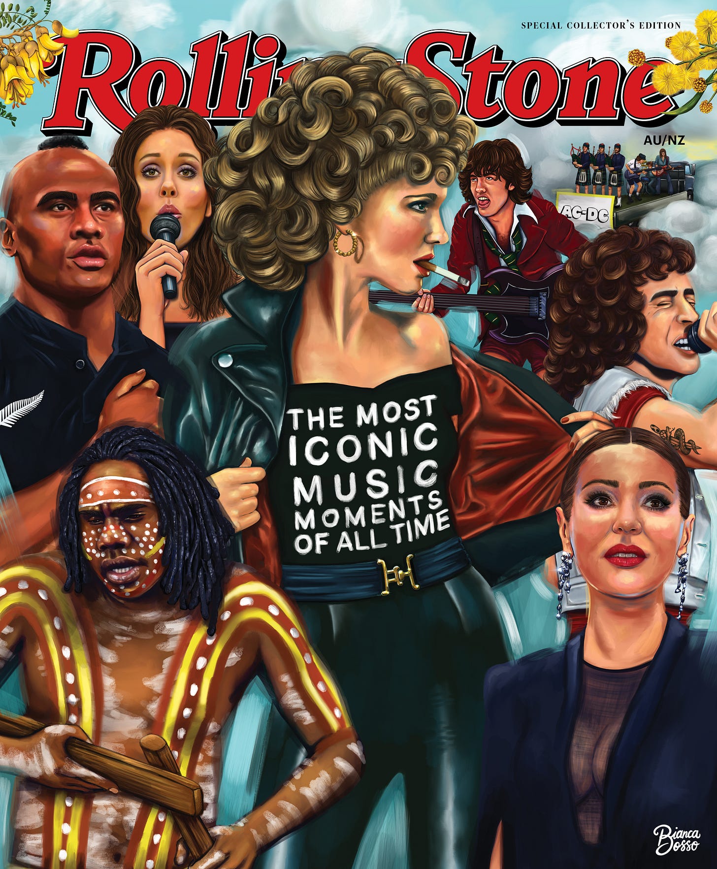 “It’s an honour to retrace many of the musical moments that have made me excited, inspired and shocked as I’ve grown up,” Bosso said. “Illustrating the cover for Rolling Stone AU/NZ has been a nostalgic and heartwarming experience. I went from reading about many of these moments in Rolling Stone to celebrating them through my illustrated cover. I hope it makes readers proud of the artists that define our abundant music scene.”