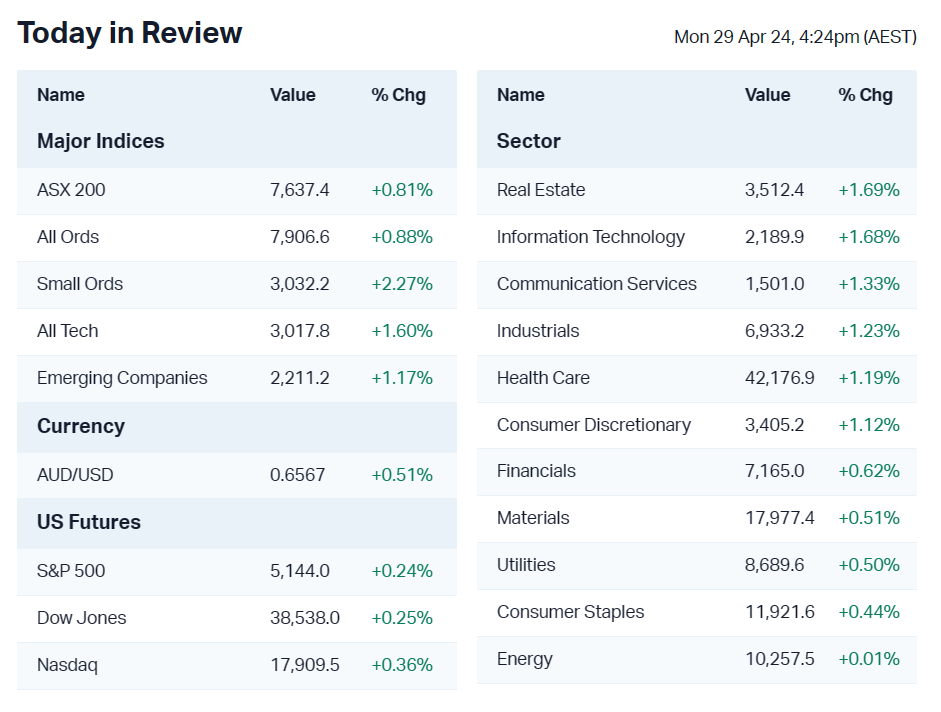 The S&P/ASX 200 closed 61.5 points higher, up 0.81%.