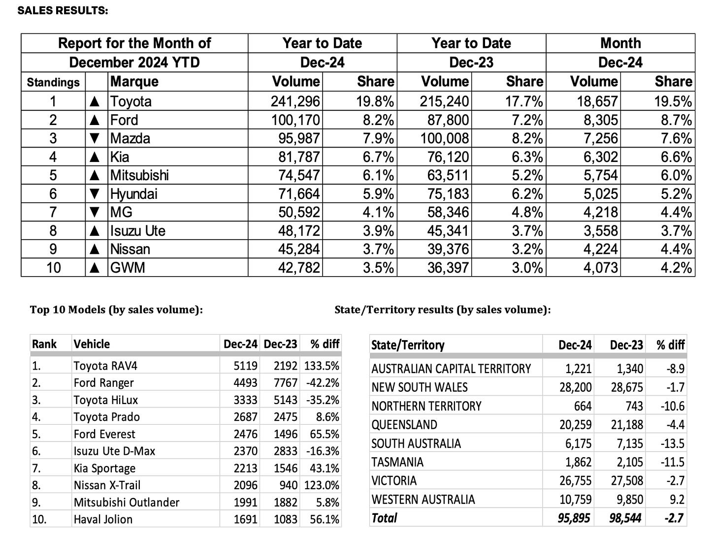 Australia's vehicle sales reach the highest ever annual result of 1,220,607 in 2024, even while December shows a -2.7% decrease on 2023 to indicate flagging market momentum