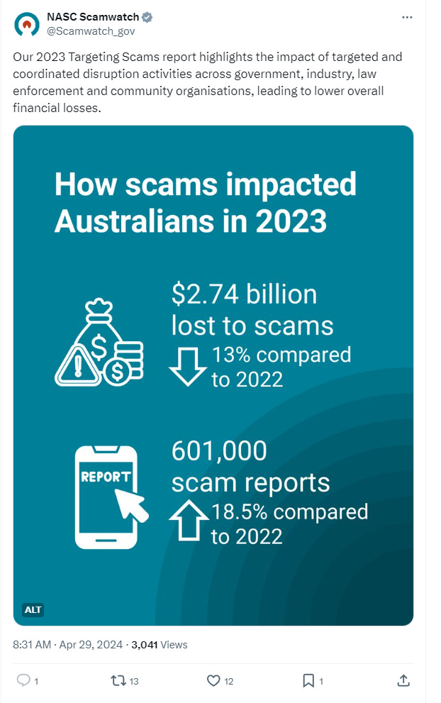 For the first time since 2016, Australians lost $2.74 billion to scams in 2023, a 13.1% decrease from the year before.