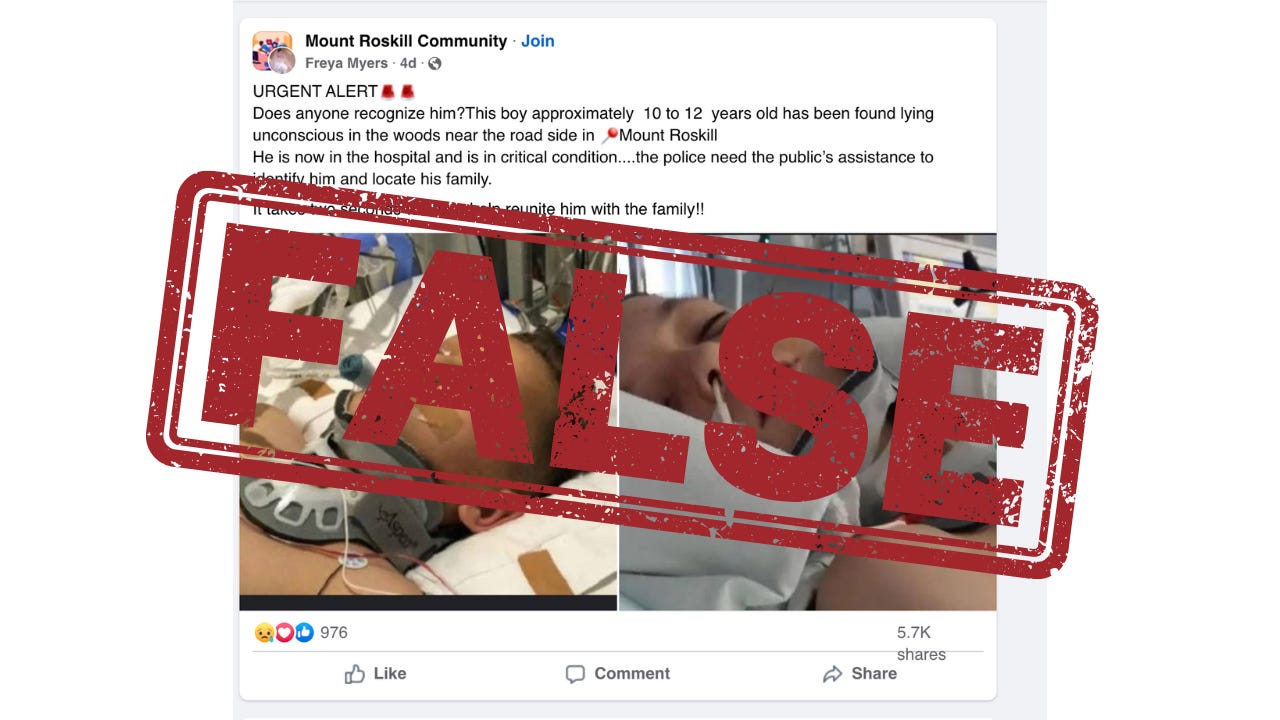 Residents of a New Zealand suburb are being urged to help a young boy found unconscious on the side of the road, but it's a social media scam.