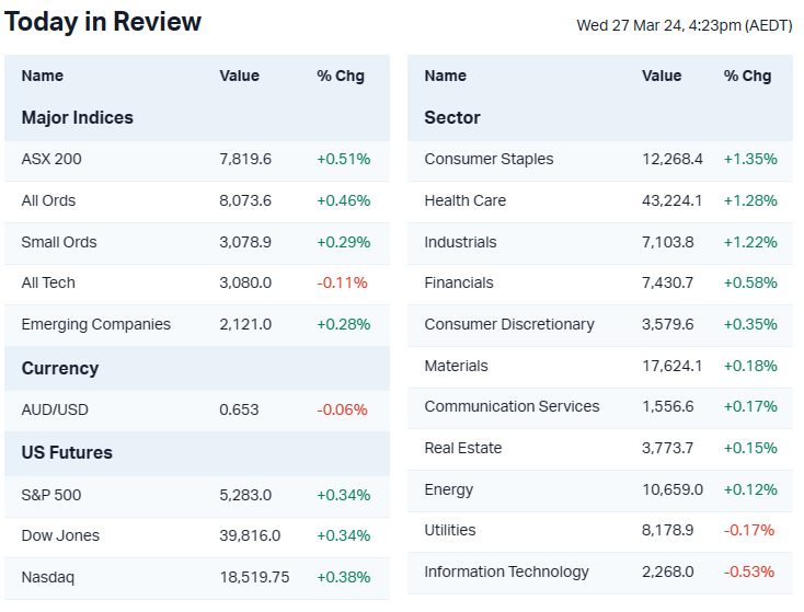 This boosted the S&P/ASX200 by 39 points, putting it 34 points from a record. The benchmark index closed on its high, indicating more strength, and gains were broad-based. [ Continue ]