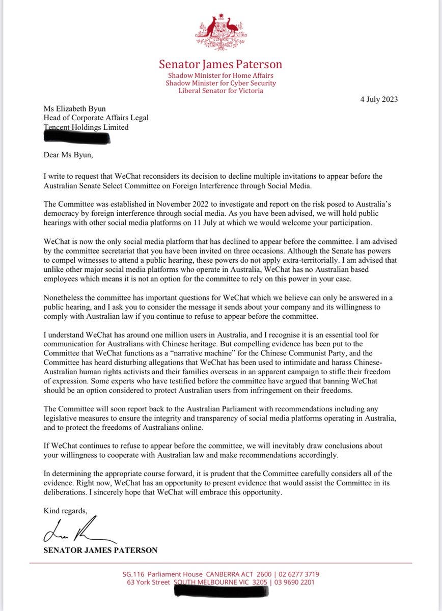 WeChat declined Senator Paterson's invitation in a letter, saying "WeChat does not have local operations or employees in Australia, so regretfully we are unable to attend the hearing today (July 11)".